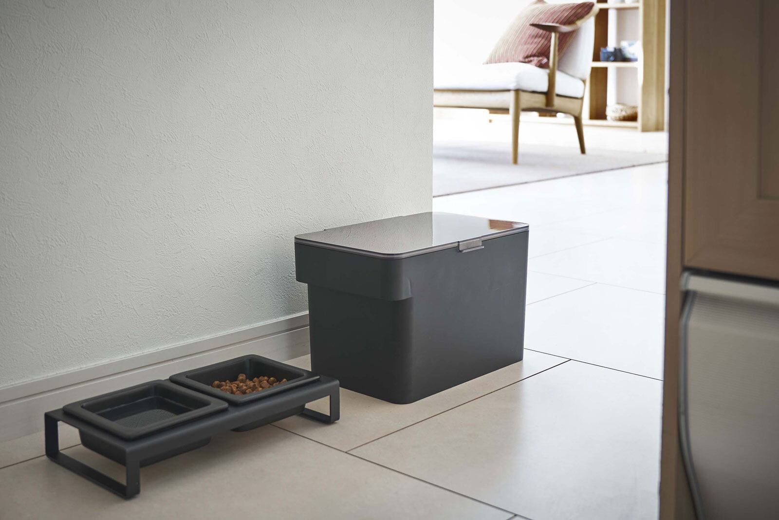 リビングやキッチンにそのまま置けるスタイリッシュなペットフードストッカー。蓋をパチッとロックしておけば、湿気・酸化・臭い漏れを防いでくれます。蓋は全面が開くからペットフードがすくいやすく、残量が分かりやすい透明蓋になっています。
