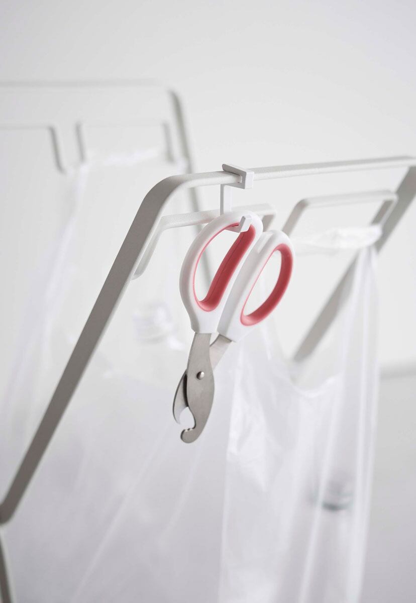 30Lのゴミ袋やレジ袋をそのまま掛けられ、分別も可能な開閉式のゴミ袋スタンド。レジ袋を引っ掛けるだけで野菜クズや食品トレーなどの資源ゴミを、手軽に捨てることができます。空き缶やペットボトルの分別も可能です。また、付属のフックには分別バサミ等の小物を掛けられます。