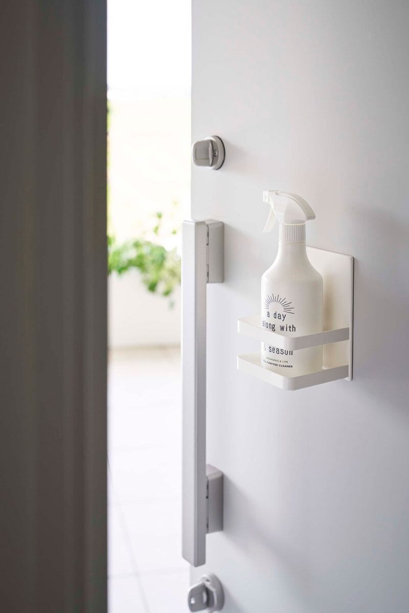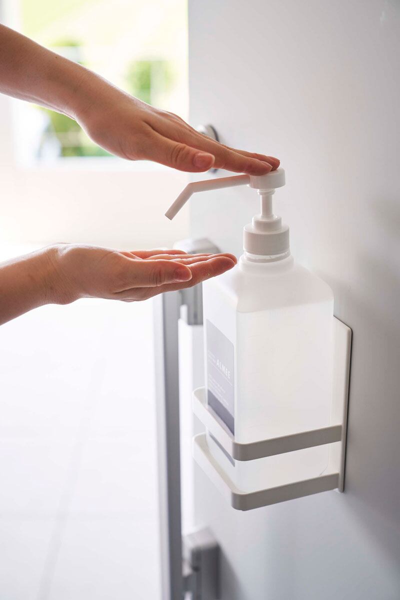 マグネットで玄関扉に 簡単取り付け。帰宅後すぐに除菌ができるアルコール除菌ボトルホルダーです。マグネットの付く玄関扉や壁面に簡単設置で、お好きな高さに取り付け可能です。付属のフックにマスクなどを収納できます。
