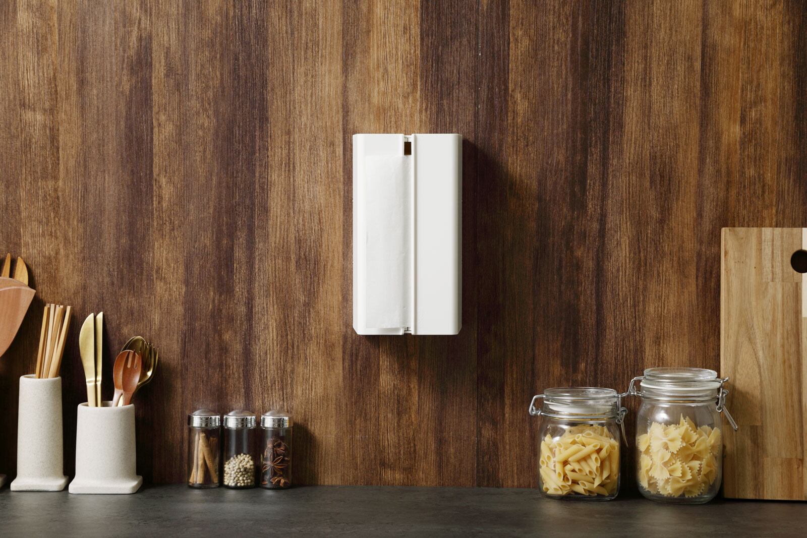 たっぷり収納、収めてスッキリ。徳用サイズ対応の壁掛けペーパータオルケース。徳用サイズのペーパータオルやキッチンペーパーを、袋のパッケージのまま入れて使えます。