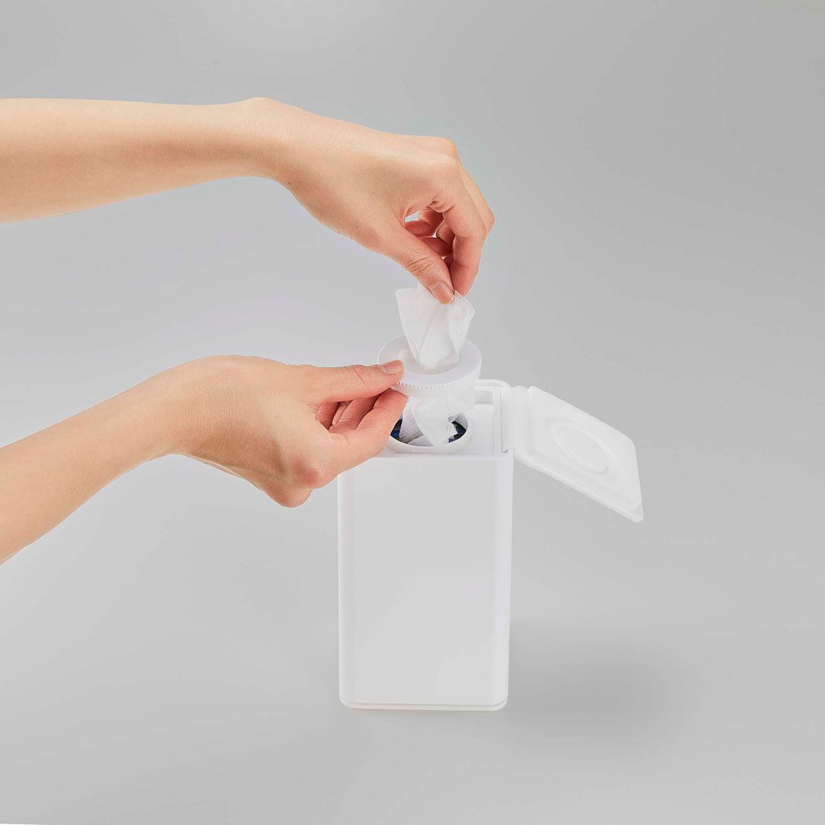 ロール型のウェットティッシュを収納できるスタイリッシュなケースです。全面シリコーンキャップでできているのでしっかりと密閉し、保湿します。ロール型ウェットティッシュを袋ごと詰め替えができます。