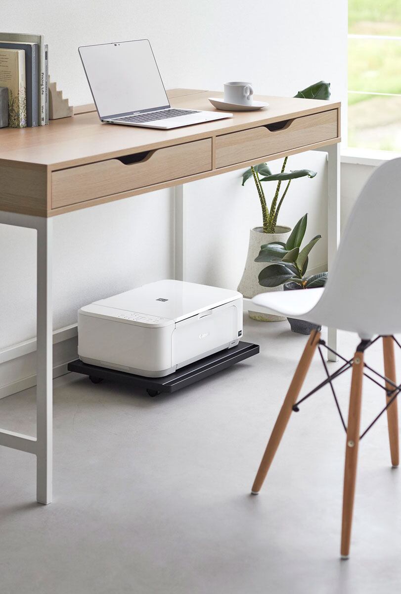 使う時だけ引き出せる便利なキャスター付きのプリンターラックです。使わない時はデスク下にすっきり収納でき、A4プリンターにピッタリのシンプルなラックとして最適です。キャスター付きなので、移動もスムーズで、加湿器の収納にも便利です。