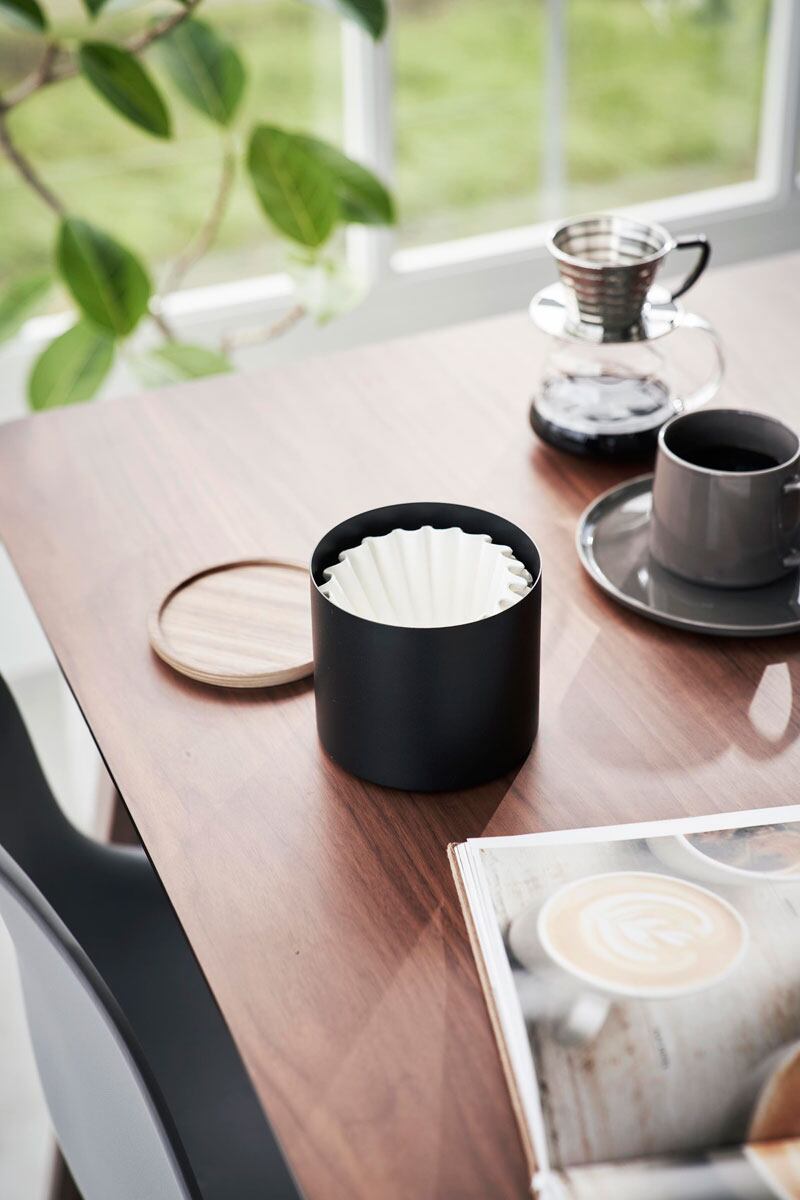 置き場所に困るバスケットタイプのコーヒーペーパーフィルターを美しく収納する、RIN バスケット型コーヒーペーパーフィルターケース Sサイズ。1〜2、2〜4杯用にピッタリ。蓋付きなので、ほこりが入りません。