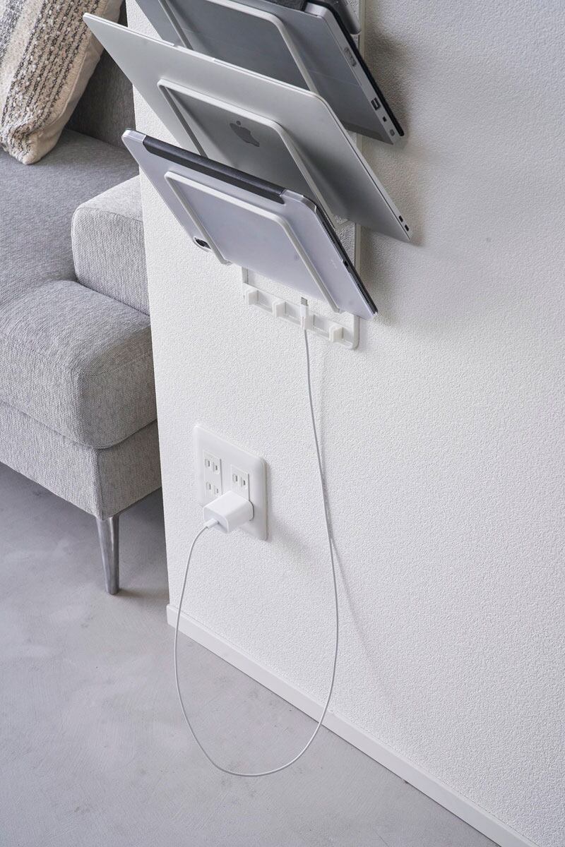 置き場所に困るノートPCや学習用タブレットを壁面にスッキリ収納できるタブレットホルダーです。穴が目立ちにくい石こうボードピンで、お好みの位置に設置可能。斜めに収納するので出し入れがスムーズです。