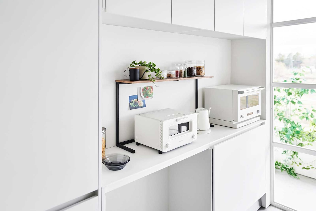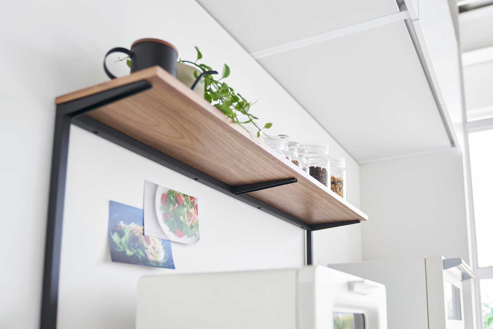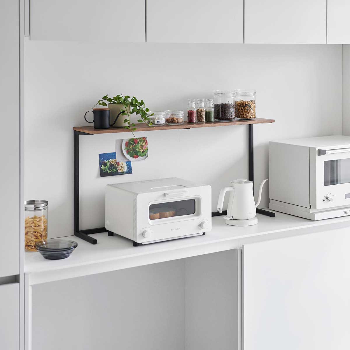 電子レンジなどのキッチン家電の上のスペースを有効活用できる棚です。フレームの存在感が少ないデザインで、キッチンに馴染みます。