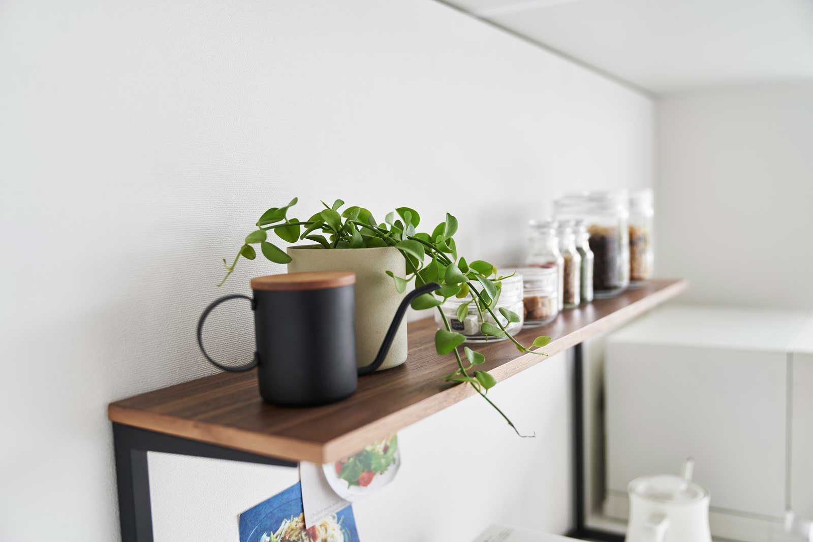 奥行きが18cmあるので、食器やキッチンツールをディスプレイしながら収納できます。耐荷重は7kgあり丈夫。置くだけの簡単設置、壁にネジを打ち込むことなく棚ができます。