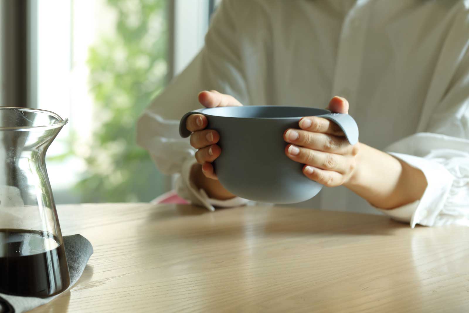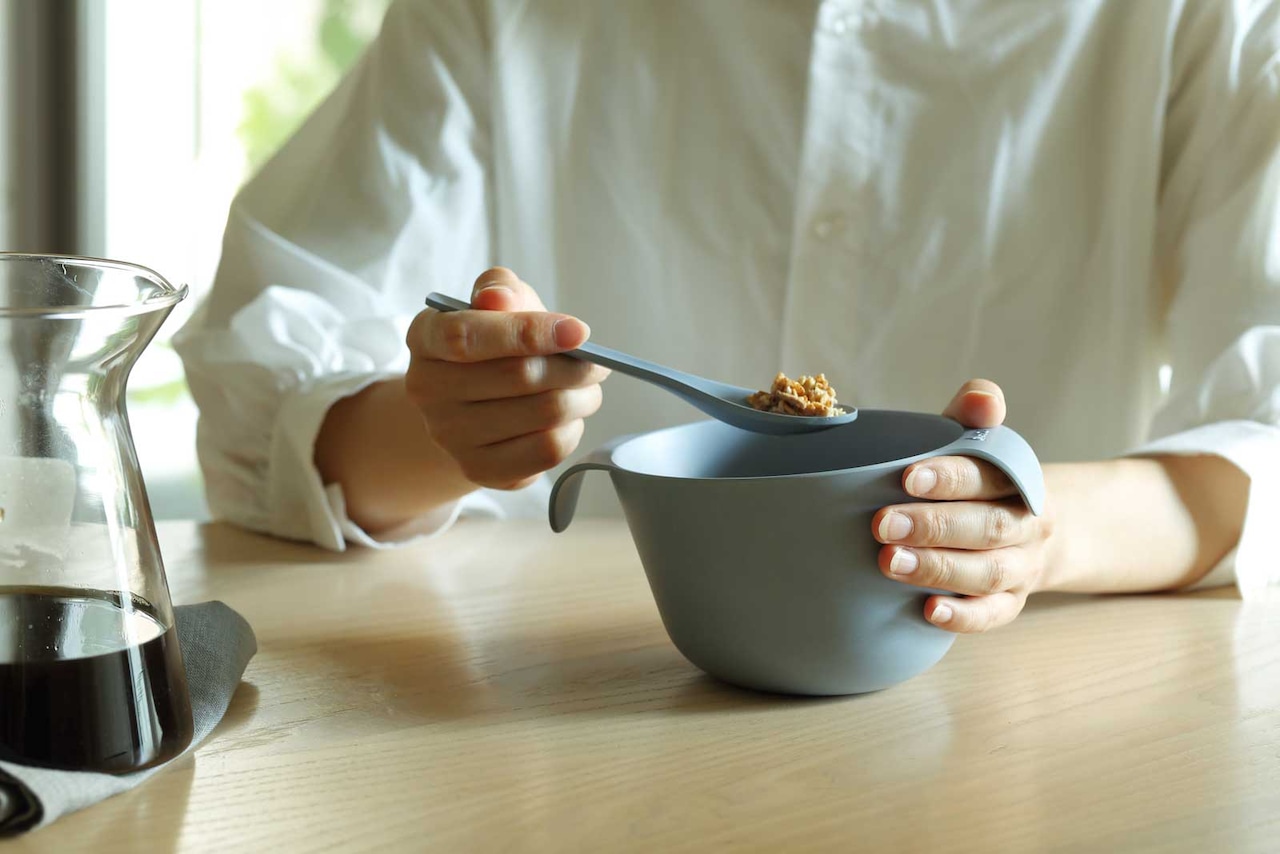 食器の片面を、内側に向かって斜めに設計することで返しができ、食材がスプーンにのりやすく、すくいやすいよう設計。Mサイズは、お茶碗と丼の中間サイズで手の力が弱くても安定し支えれるよう両手を引っ掛け持ち上げることもできる仕様となっています。