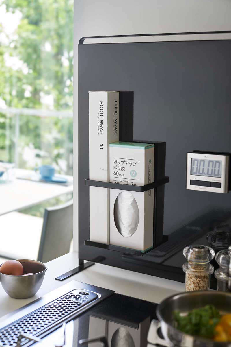 別売のキッチン自立式スチールパネル タワー 横型や縦型にも対応します。また、ポリ袋箱も収納可能です。