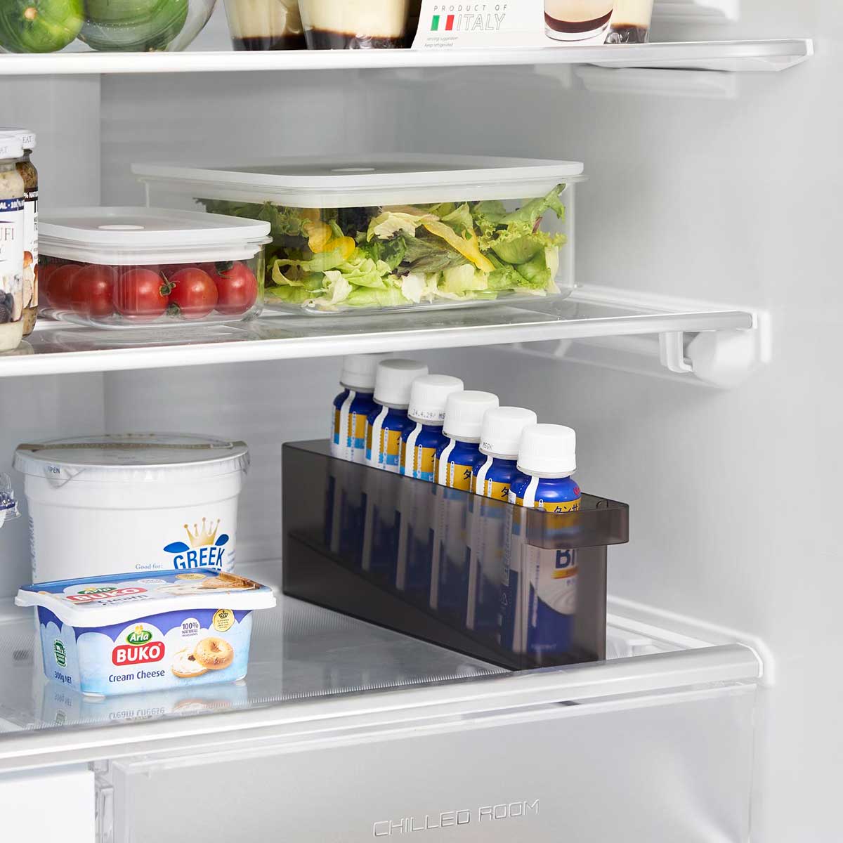 ミニドリンクを縦1列にスッキリと収納します。冷蔵庫中で収納しにくいミニドリンクをきれいに収納しておけます。斜めトレーを底に入れると、ドリンクを取り出すごとに後ろのドリンクがスライドして前に出てきて便利。