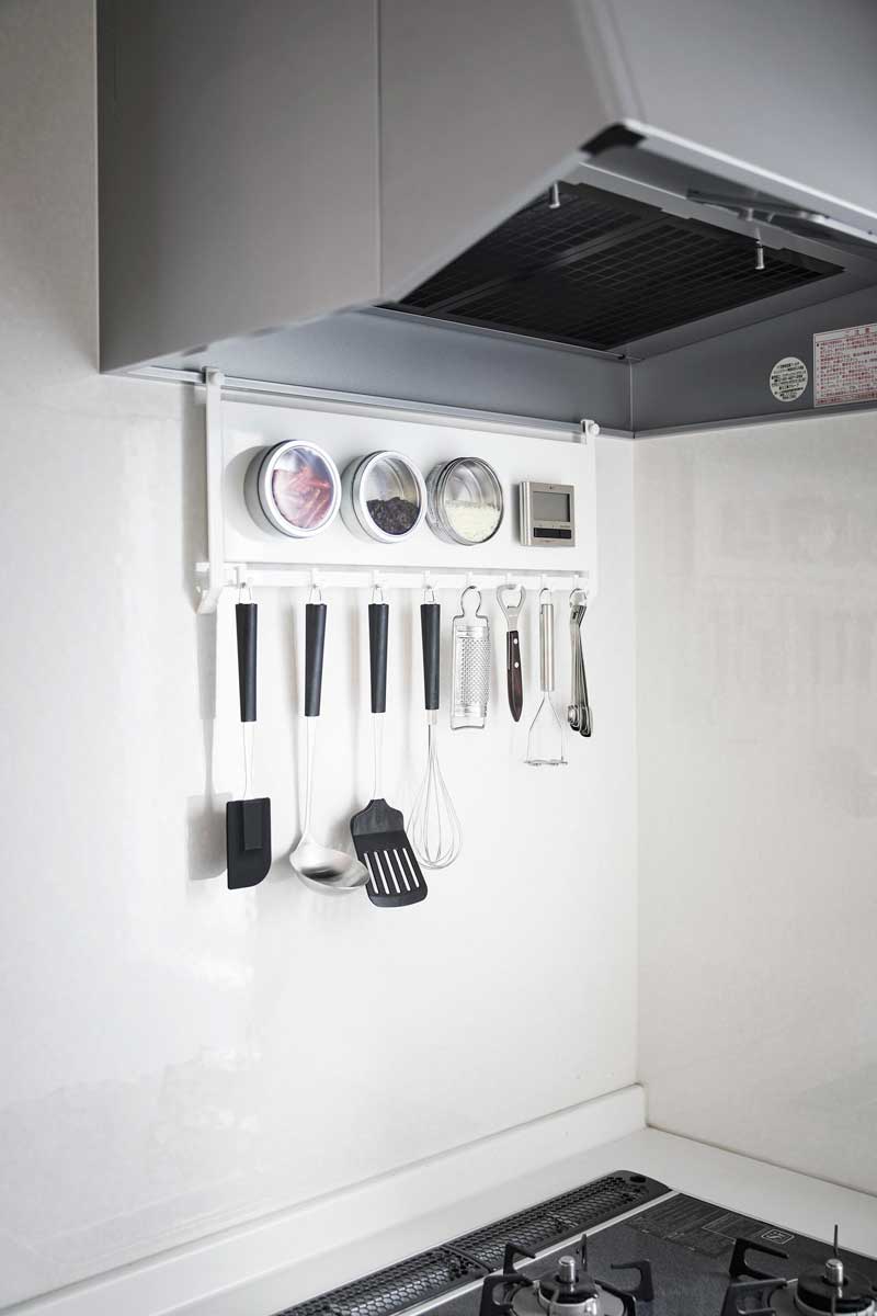 キッチンツールなど、すぐに使いたいキッチン小物などを付属のフックに引っ掛けて収納すると便利に使えます。スチールパネルは調節ネジでしっかり固定できます。