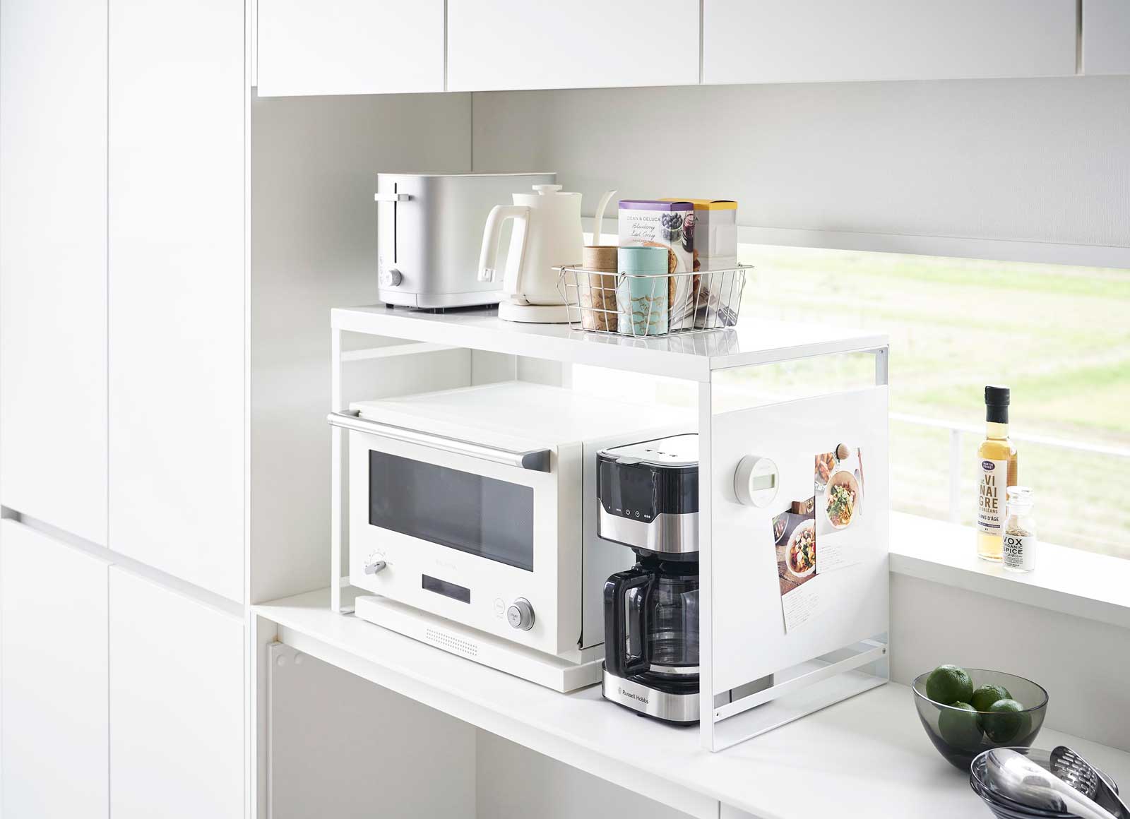 オーブンレンジのまわりを有効活用できるスチールパネル付きレンジラックです。側面のスチールパネルにマグネットアイテムを取り付ければ、自分だけのオリジナル収納がつくれます。