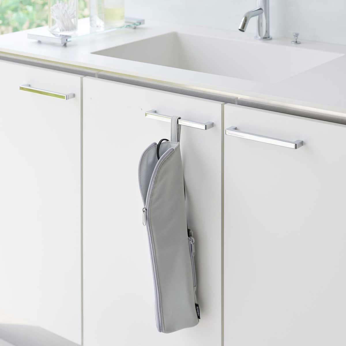 ヘアーアイロンを熱いまま収納できるヘアーアイロンポーチです。ボタン開閉式のストラップでタオルバーなどに吊り下げられ洗面所にスッキリ収納できます。収納したヘアーアイロンはカバーで覆われているので子供やペットにも安心です。