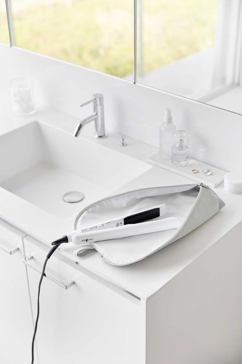 裏生地は耐熱温度300℃なので使用中のヘアーアイロンを熱いまま置くことができます。ファスナー付きポケットには電源コードが収納でき、出し入れもスムーズ。ポーチのファスナーは上まで閉まるので、持ち運びの際もヘアーアイロンの飛び出しを防止できます。