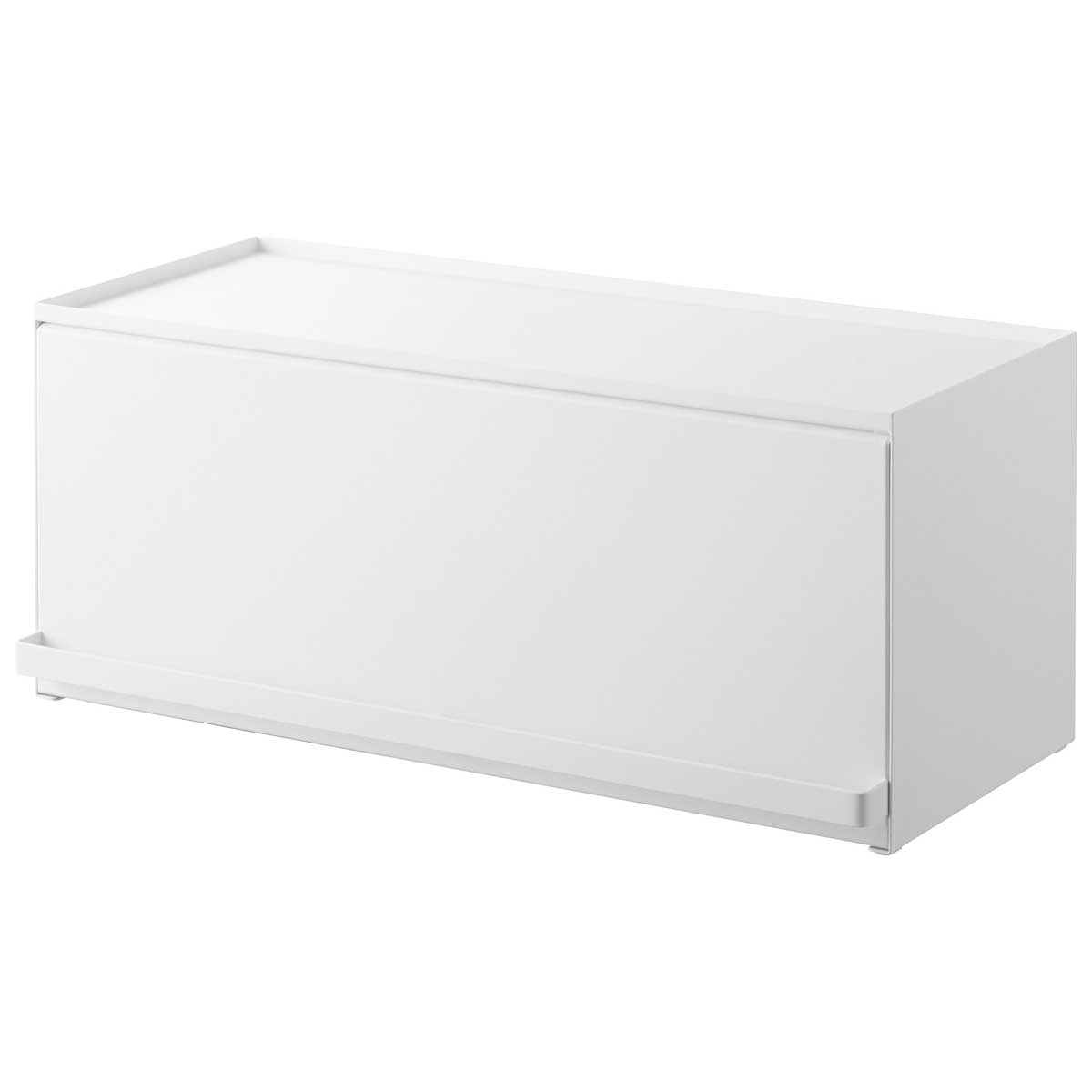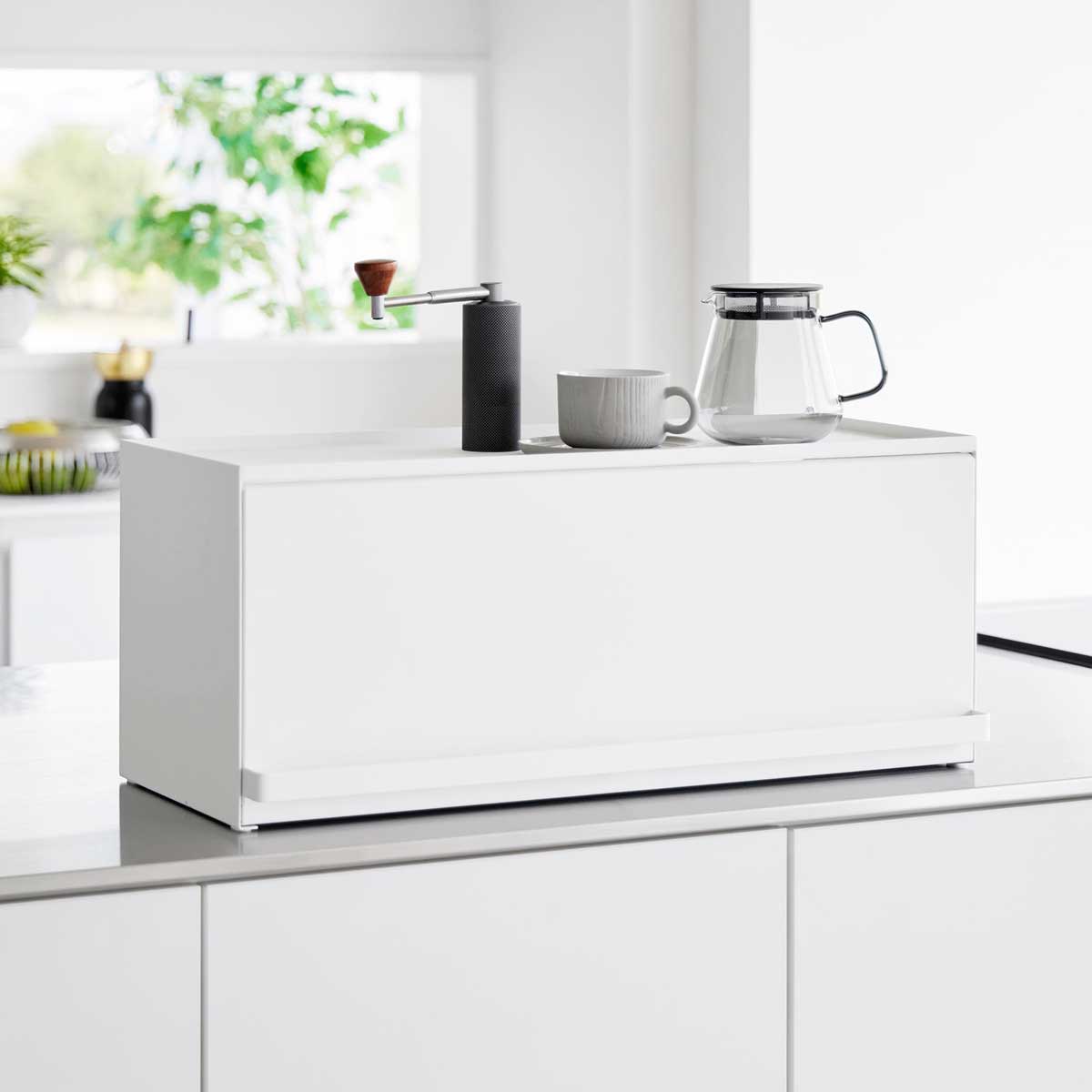 リビング側は全面が開くフラップ式の扉なので、中の物も取り出しやすいです。キッチン側は扉がないのでサッと物の出し入れがしやすいです。壁際に設置すればブレッドケースとしても使用でき、天板にはトースターを設置することができます。